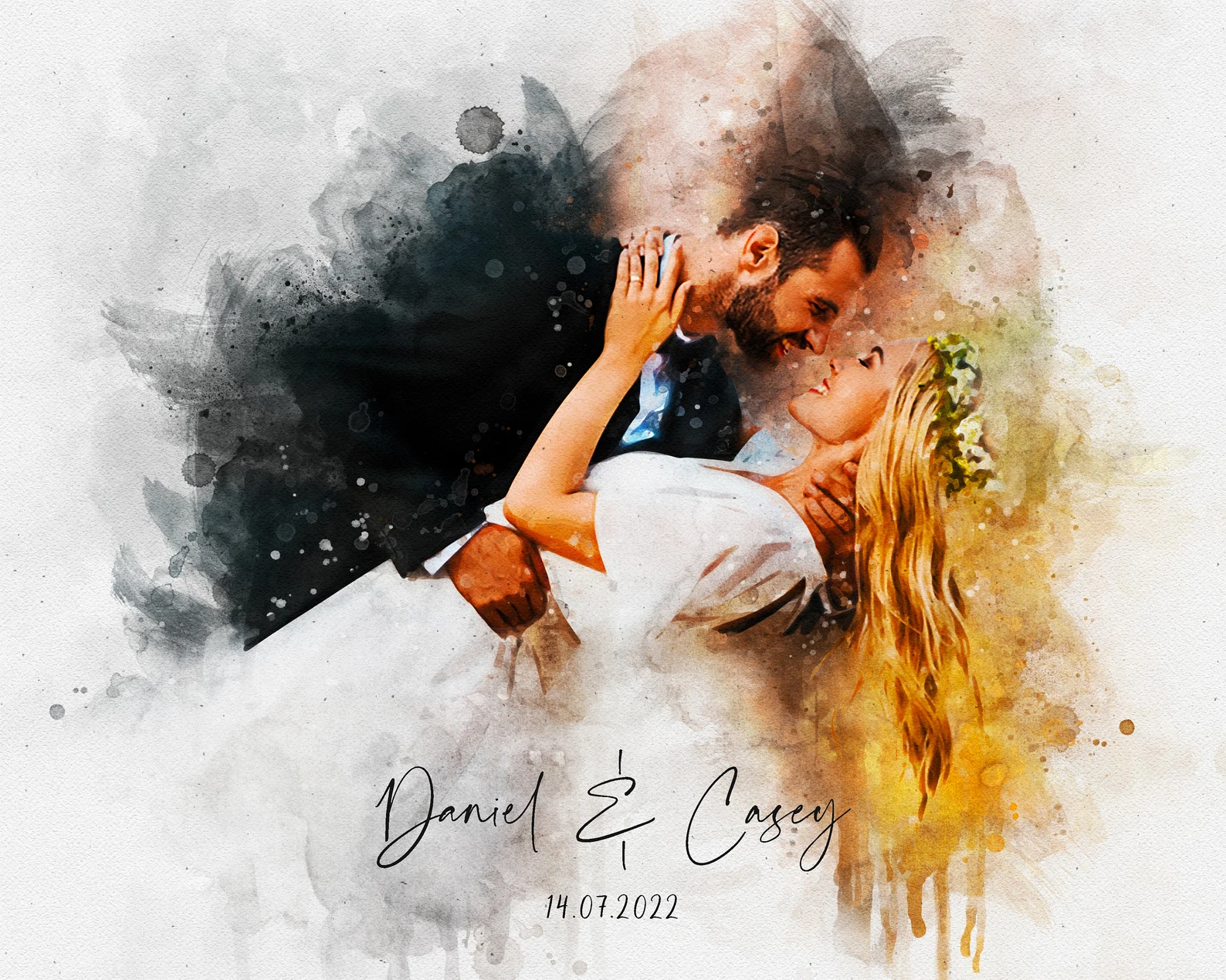 Capture the magic of your special day with a Custom Wedding Portrait! This beautiful, hand-painted watercolour illustration transforms your cherished photo into a unique keepsake, perfect for celebrating love and commitment. Ideal for wedding anniversaries, engagements, or as a thoughtful gift for couples, this artwork is created with meticulous attention to detail to reflect the warmth and joy of your relationship.