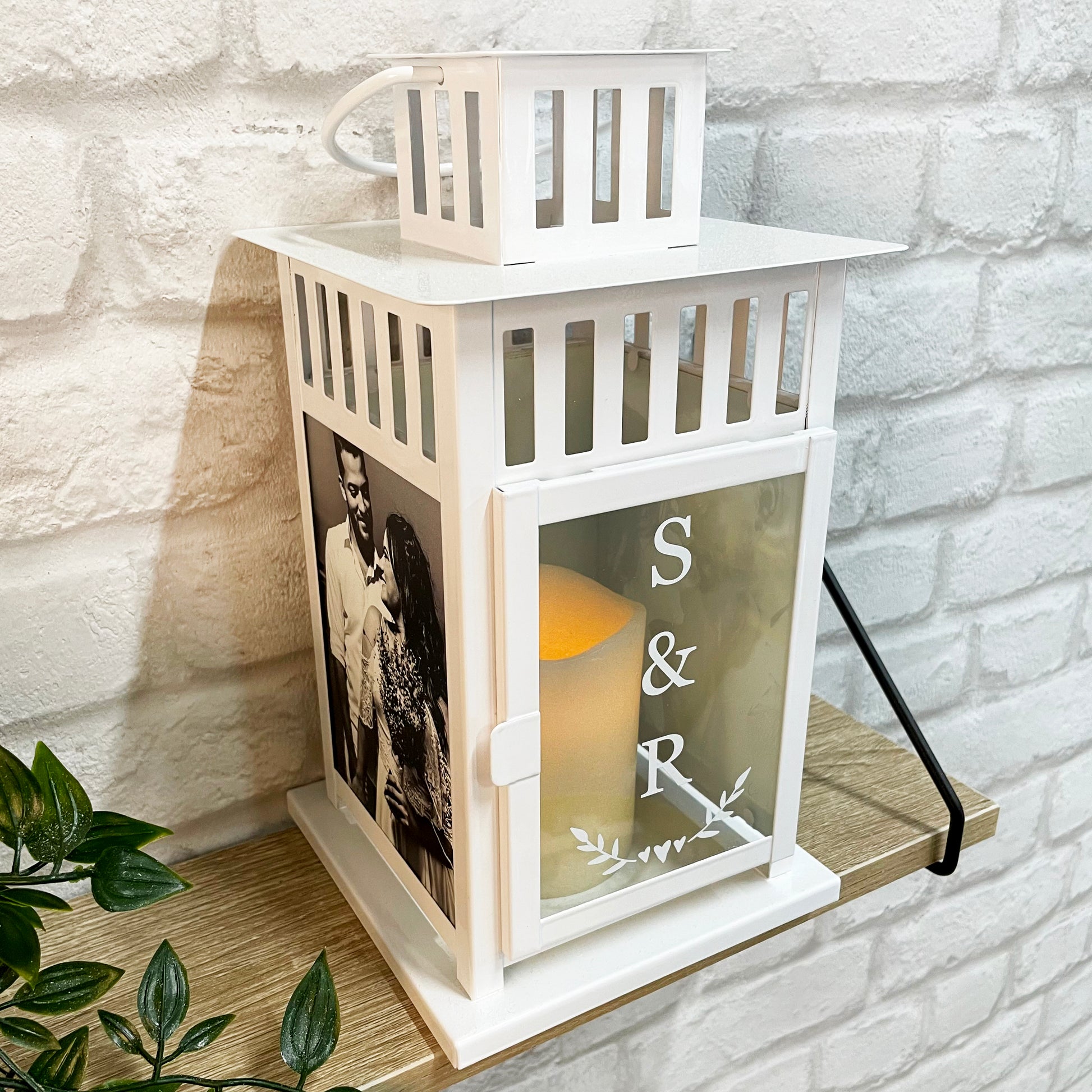 Personalise our lanterns with 3 colour or black and white photos of your choice and the couples initials on the front of the lantern.